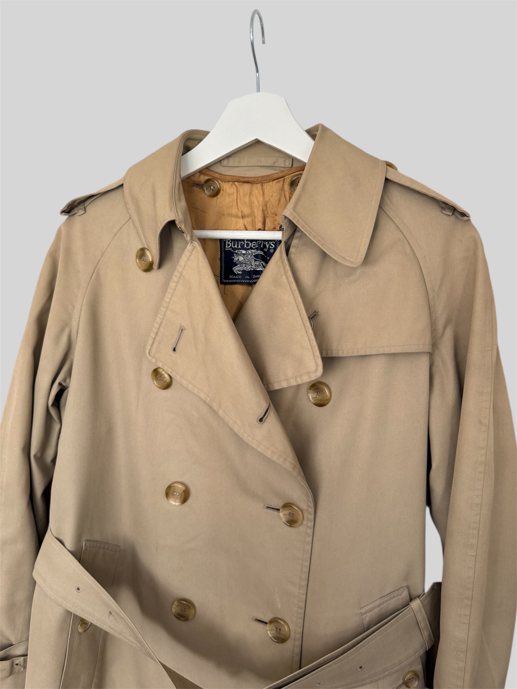 Condition: good vintage condition - an amazing and rare example of a 1990s trench coat with its original inner lining! This piece is in very good condition for its age with a few marks on the back, front and collar which can most likely come out if taken to the dry cleaners and treated properly seen in photos. All buttons are in tact and the belt buckle and sleeve buckles are all there with no flaws.